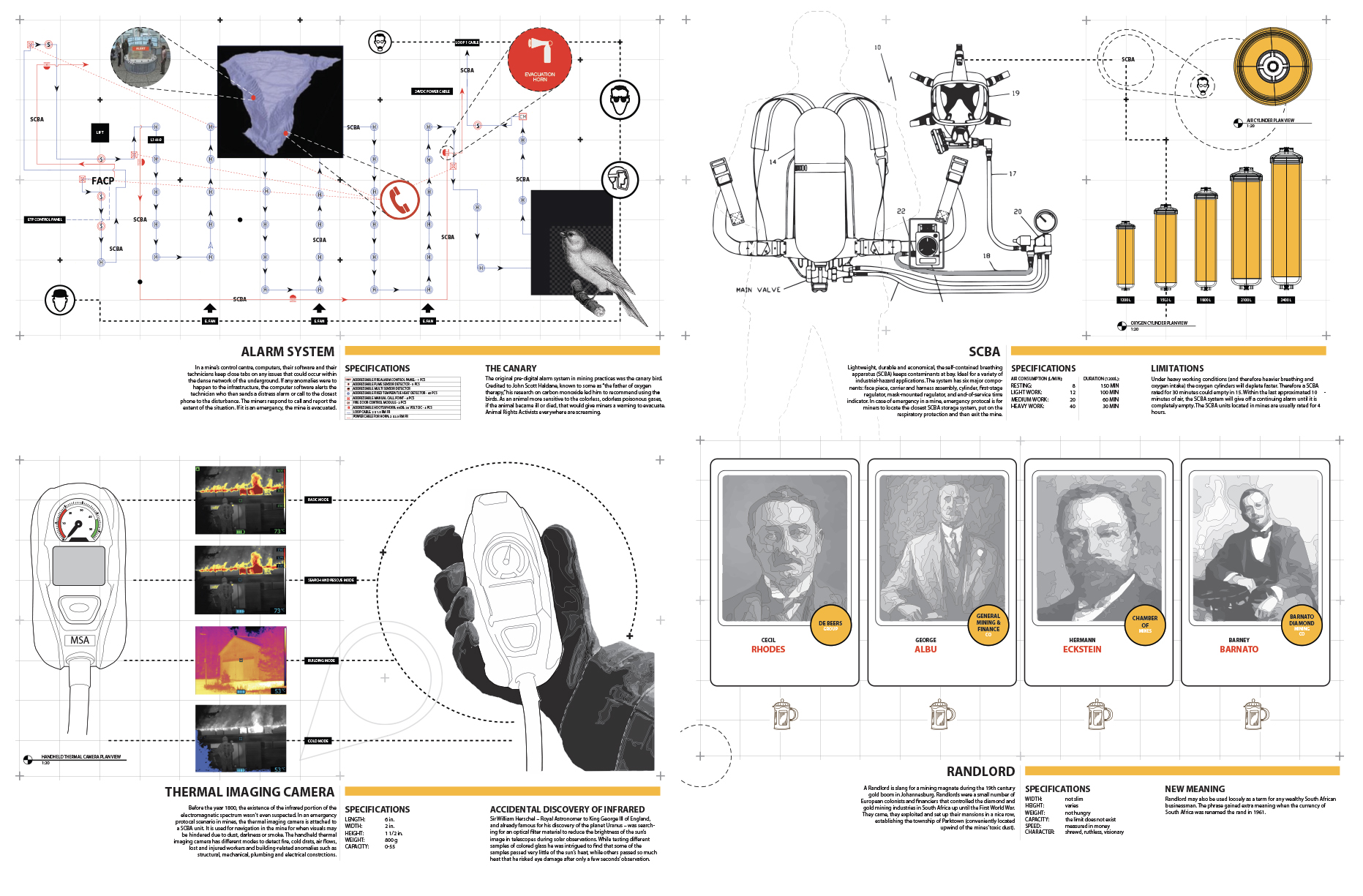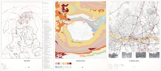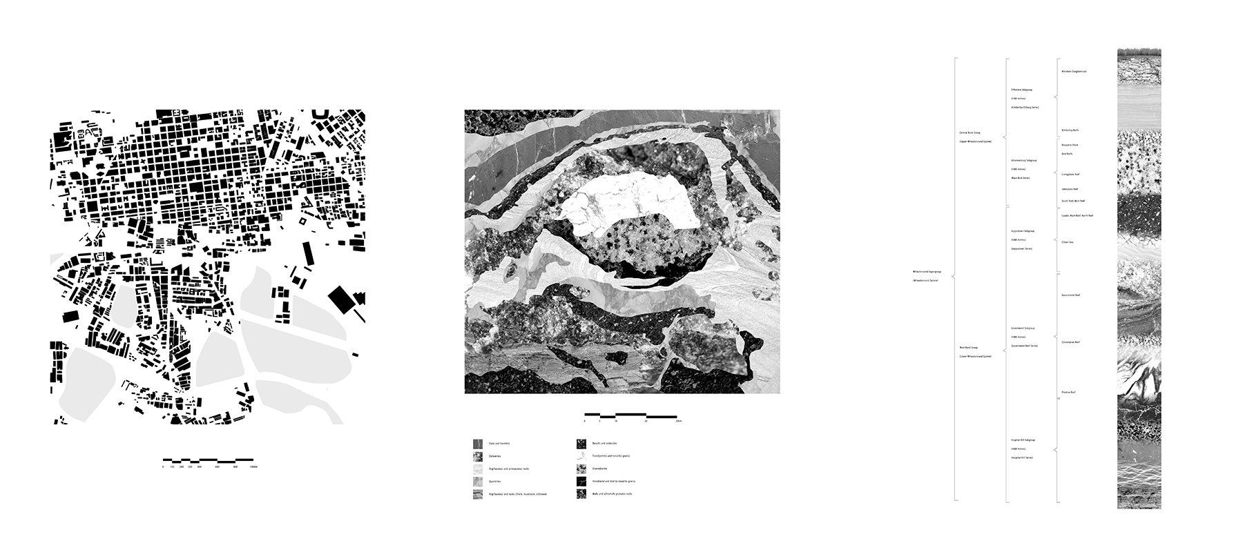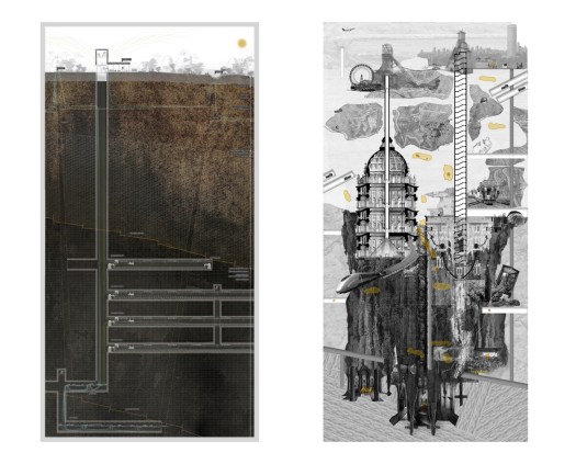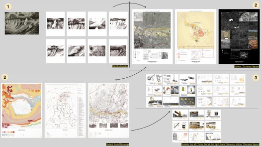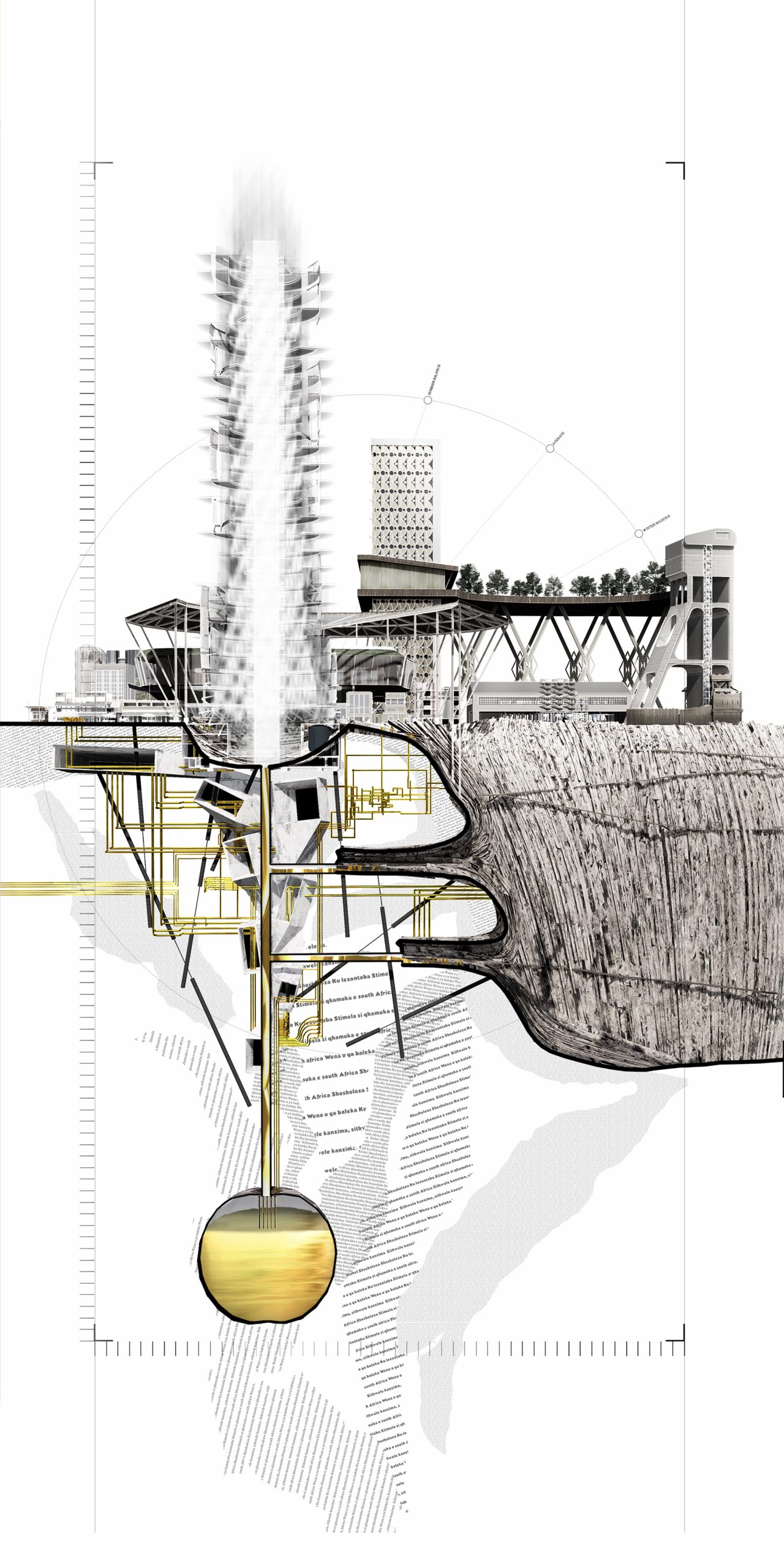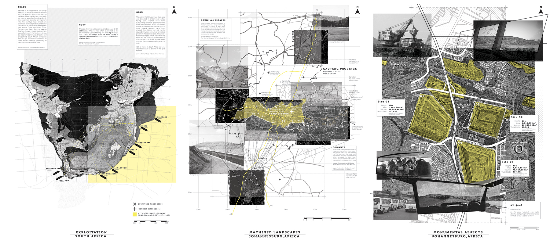 Sited in Johannesburg, South Africa, this studio took the geological, elemental and mineral (diamonds, gold, platinum) histories of Johannesburg’s “Elusive Metropolis” as a provocation to explore – through mapping, technical and narrative representation – the spatial and social implications of an extractive terrain. The studio emphasized design-research and included critical mapping, the development of a spatialized tool atlas, and culminated in the production of a single drawing – a deep section – that situates a speculative, ethical future for future Johannesburg landscape. Projects, as a result, were situated in the geologic, as well as in the socio- cultural, and fraught, history of this post- apartheid city. The studio was structured as a studio/seminar, with regular reading and film discussions (including texts and films by South African writers and filmmakers)and each week included a series of critical readings and viewings that helped form the intellectual framework of the studio. Student work featured in this gallery includes: Joel Tremblay, Angela Chiesa, Camille Ringrose, Kristen Oyama, Sally el Sayed, Stephanie Chretien, Vedad Haghighi, Adrian Hong and Nick Bava.