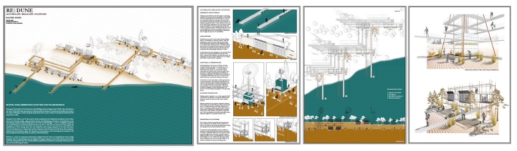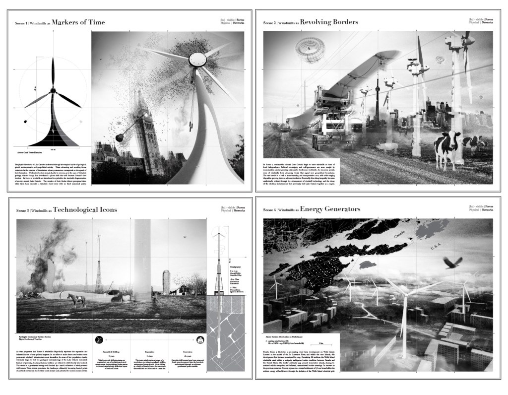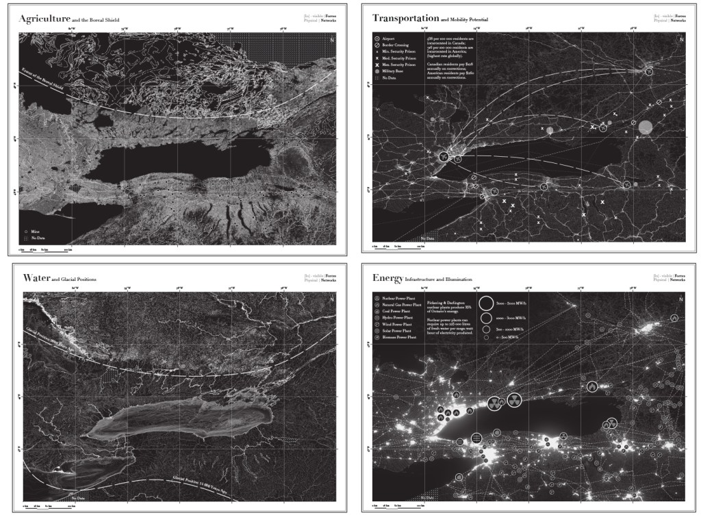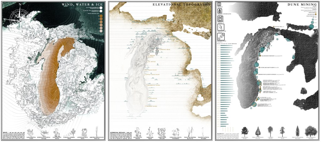 This 6-week graduate studio took a speculative design approach to investigate the potential implications and transformations of urban sites in the Great Lakes basin. Students began with critical mapping of each of the Great Lakes, followed by the development of a critical design proposal on/near or in a lake of their choosing. The studio benefitted from the expertise of Professor Karen Lutsky (Great Lakes Design Labs, University of Minnesota Department of Landscape Architecture) and Professor Sean Burkholder (Weitzman School of Design, Department of Landscape Architecture at the University of Pennsylvania); authors of 5 Bay Landscapes: Curious Explorations of the Great Lakes Basin (Pittsburgh University Press). Work featured in this gallery includes student maps and drawings by Kristen Smith, Rachel Rodd, Michel Pilon-Briggs, David Anderson and Martin MacDonald